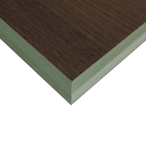 Vochtwerend MDF (Medium Density Fibreboard) wordt geproduceerd uit dunningshout en reststromen van de houtindustrie. Diverse naald- en loofhout soorten vormen de basis voor dit door en door zwart gekleurde product. Verspaningsmachines verkleinen het dunnings- en resthout tot spaanders. Deze houtspaanders worden vermalen tot vezels met het juiste formaat die geschikt is voor de productie van vochtwerend MDF. De vezels worden gedroogd en in veel gevallen voorzien van groen pigment en een vochtbestendige lijmsoort. De vezels worden uitgestrooid tot een vezellaag, afhankelijk van de persing kan deze laag wel dertig maal de gewenste einddikte van de vochtwerende MDF plaat zijn. Onder hoge druk en temperatuur wordt de vezellaag samengeperst tot een paneel. De vochtwerende panelen die uit de pers komen worden gekoeld, recht gezaagd en geschuurd tot de netto opgegeven maatvoering, rekening houdend met de toegestane toleranties.
