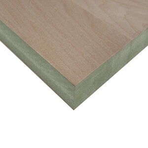 Een selectie van materialen met een vochtwerende en/of massiefhouten drager die worden toegepast bij de productie van badkamerinterieurs.